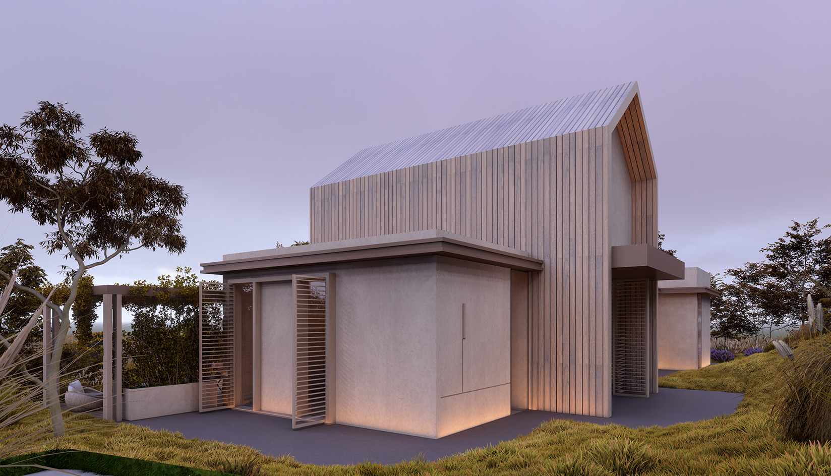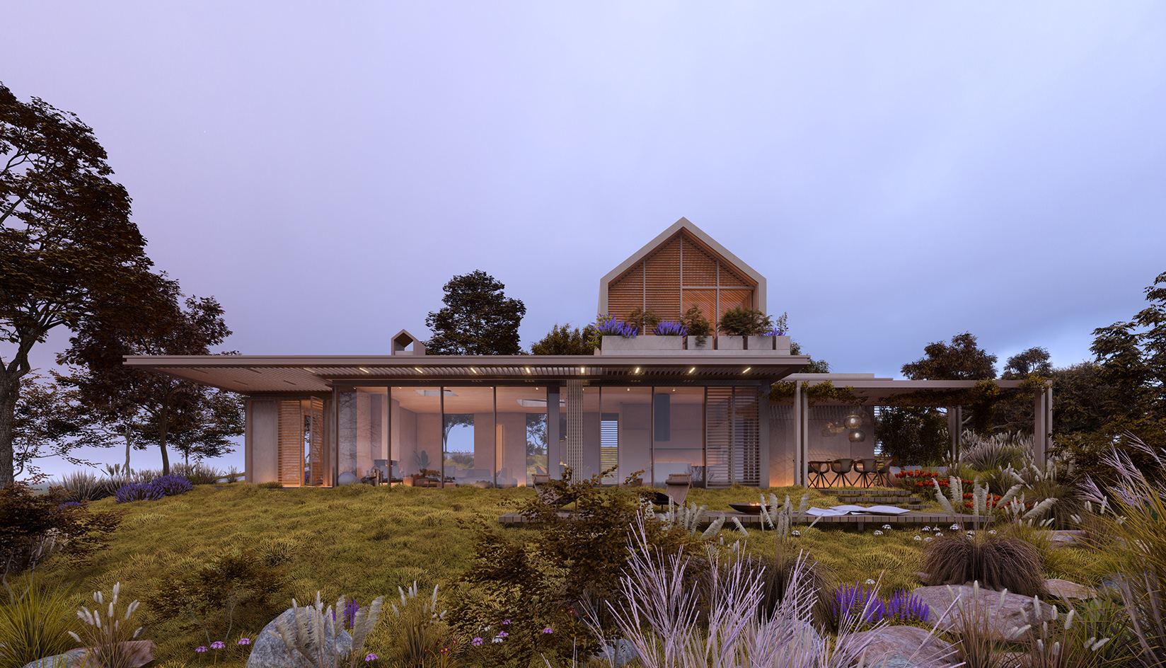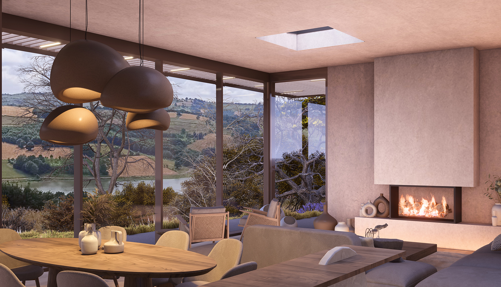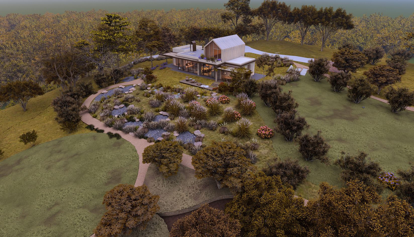 This farmhouse, offering a spectacular lake view, sits atop a hill with minimal interference to the surrounding nature and maximized transparency. The 11,000 square meters of land have been carefully rearranged to include orchards, a hen house, and walkways.